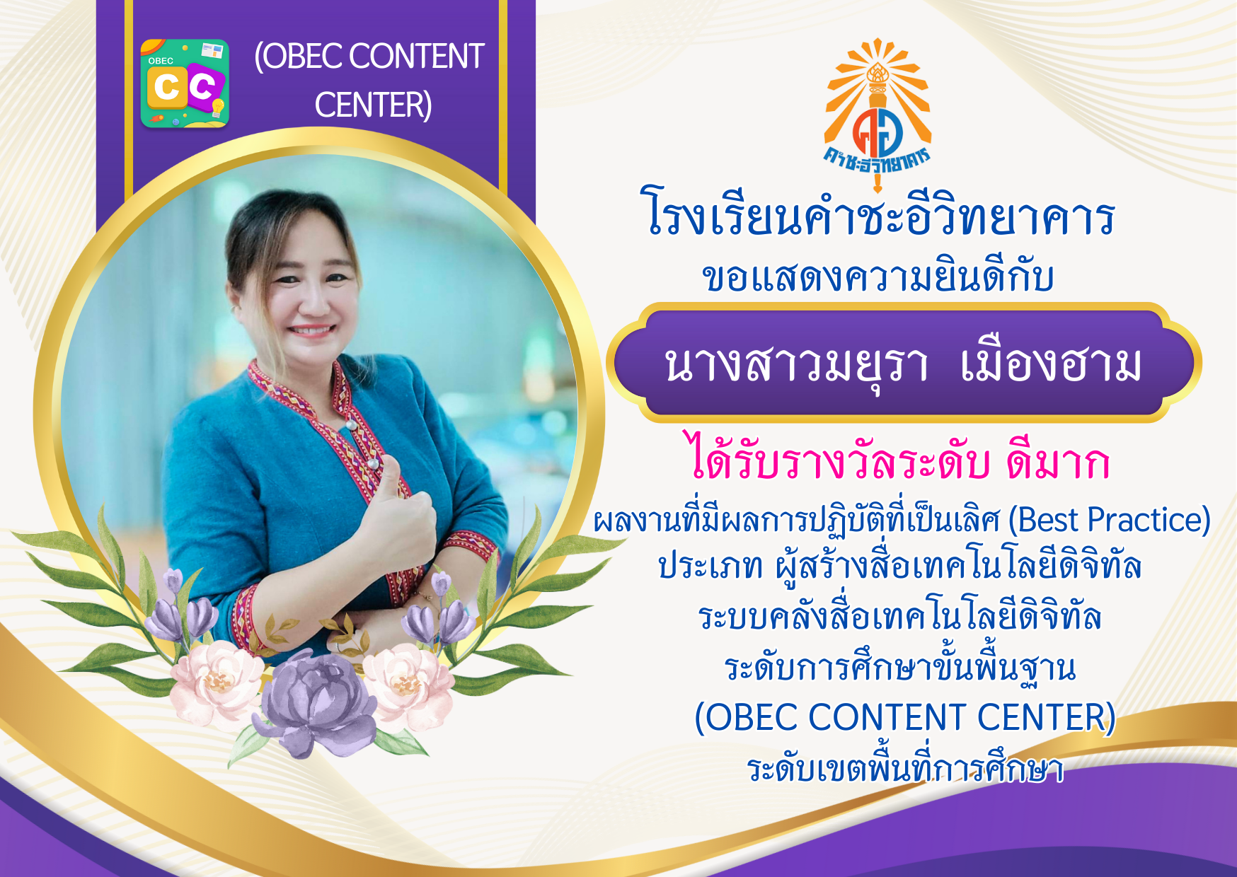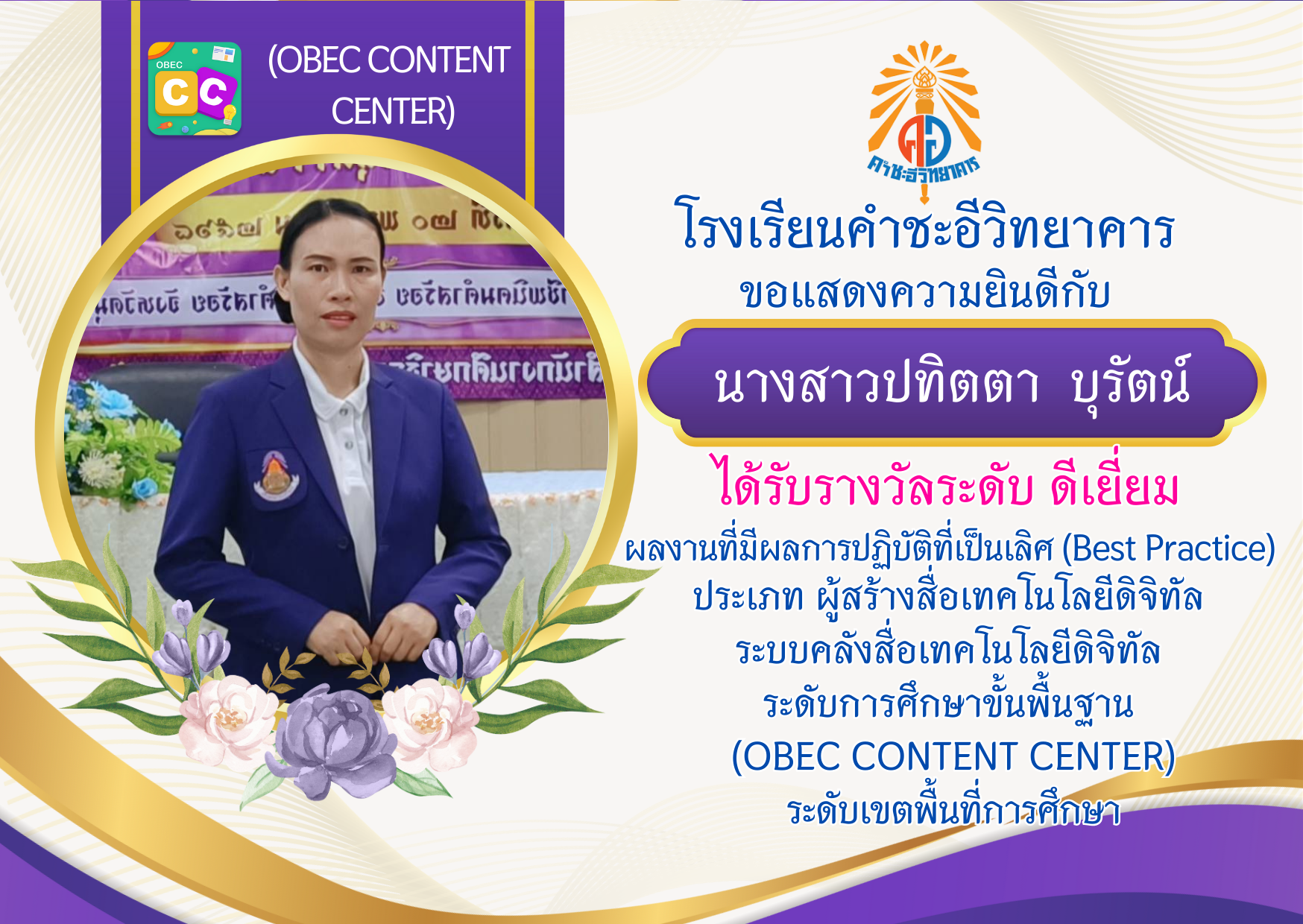 ขอแสดงความยินดีกับครูธีรวัฒน์  ศรีบุรมย์ ครูภาษาไทย เนื่องในโอกาสที่ได้รับการอนุมัติแต่งตั้งให้เลื่อนวิทยฐานะเป็นครูชำนาญการ