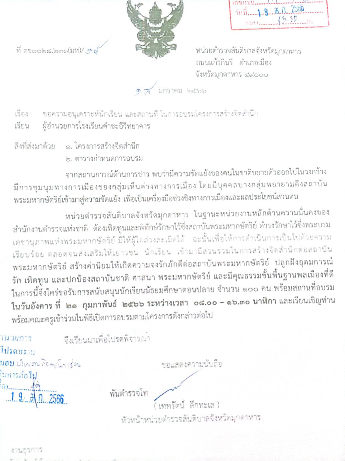 ในวันอังคารที่ ๒๑ กุมภาพันธ์ พ.ศ.๒๕๖๖ หน่วยตำรวจสันติบาล จังหวัดมุกดาหาร ได้มาให้ความรู้และปลุกจิตสำนึกให้เยาวชน นักเรียน มีส่วนร่วมในการสร้างจิตสำนึกต่อสถาบันพระมหากษัตริย์ สร้างค่านิยมให้เกิดความจงรักภักดีต่อสถาบัน ปลูกฝังอุดมการณ์ รัก เทิดทูน และปกป้องสถาบัน และมีคุณธรรมขั้นพื้นฐานในการเป็นพลเมืองที่ดี โดยได้รับเกียรติจากนายสมพงษ์ คุ้มสุวรรณ นายอำเภอคำชะอี มาเป็นประธานกล่าวเปิดกิจกรรม โรงเรียนคำชะอีวิทยาคาร ขอขอบพระคุณทุกท่าน มา ณ ที่นี้ด้วย