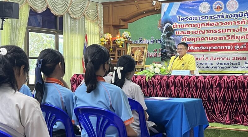 นักเรียนโรงเรียนคำชะอีวิทยาคาร เข้ารับการอบรมตามโครงการการสร้างภูมิคุ้มกันต้านการถูกล่อลวงการค้ามนุษย์และอาชญากรรมทางไซเบอร์ภัยคุกคามจากวิถียุคใหม่ (จังหวัดมุกดาหาร) รุ่นที่ ๒ ในวันที่ ๘ สิงหาคม ๒๕๖๘ ณ ห้องประชุมราชพฤกษ์ อาคาร ๓ โรงเรียนคำชะอีวิทยาคาร อำเภอคำชะอี จังหวัดมุกดาหาร