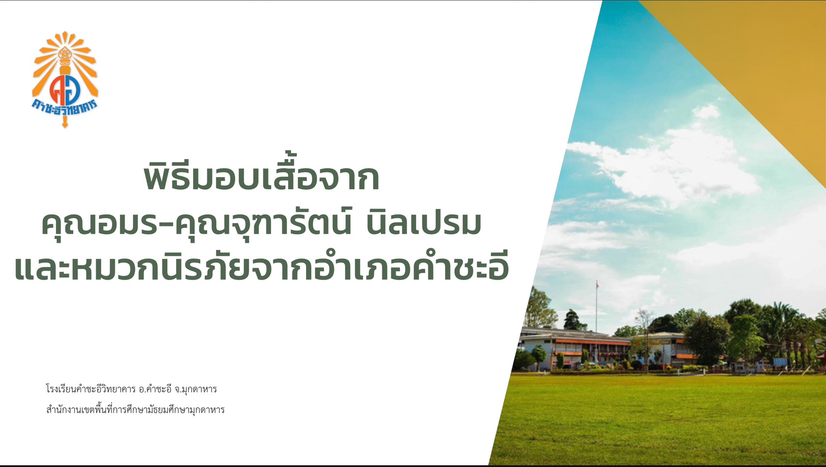 ในวันศุกร์ที่ 2 มิถุนายน ๒๕๖๖ นักเรียนโรงเรียนคำชะอีวิทยาคารได้รับความอนุเคราะห์จากคุณอมร และ คุณจุฑารัตน์ นิลเปรม ที่ได้มอบเสื้อนักเรียน จำนวน 80 ตัว และได้รับมอบหมวกนิรภัยจาก อ.คำชะอี จำนวน 55 ใบ ทางโรงเรียนขอขอบพระคุณ มา ณ ที่นี้ด้วย