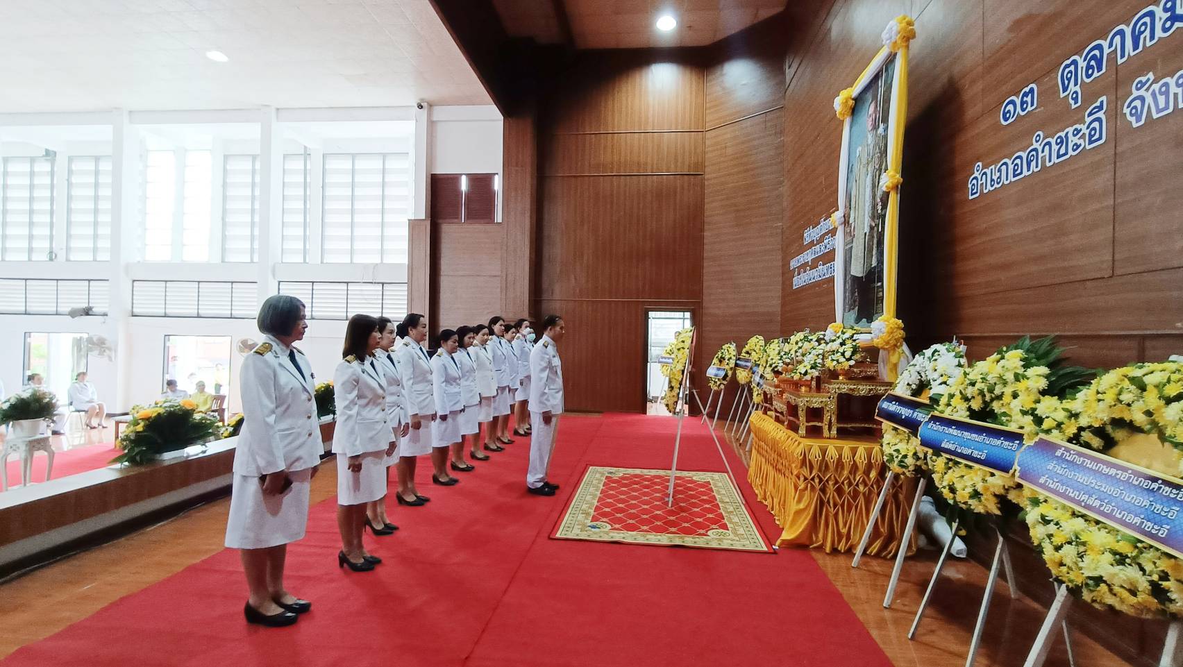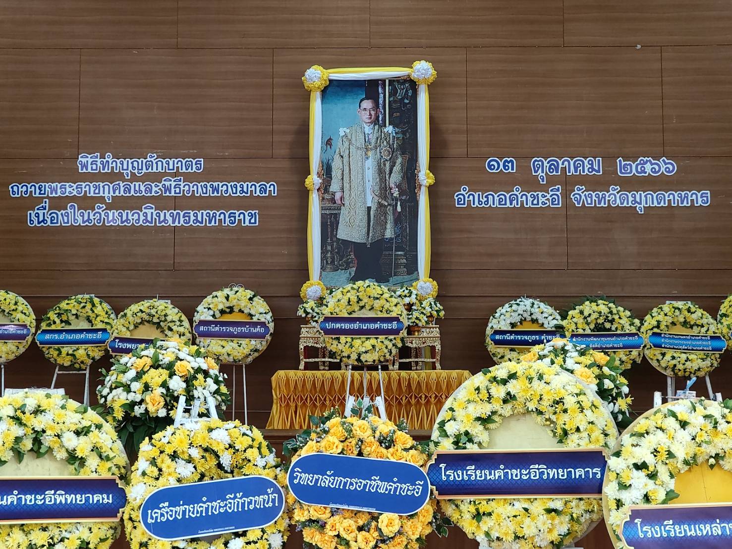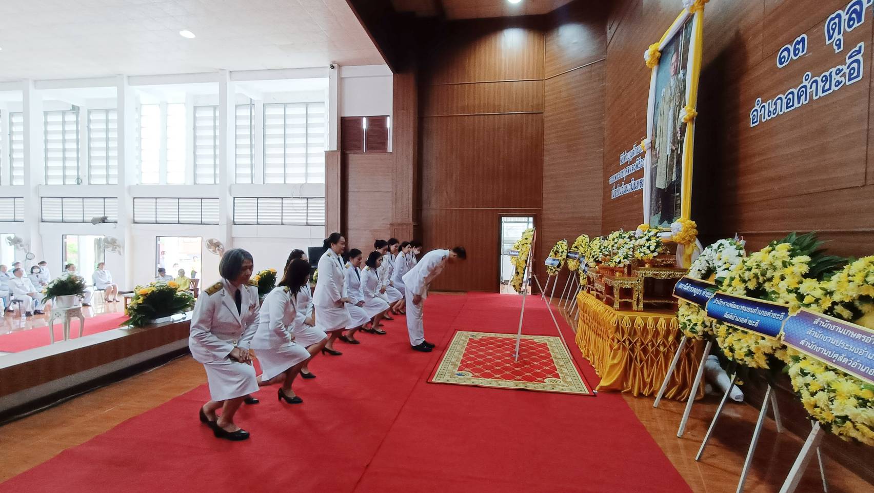 ผู้บริหาร และ คณะครูโรงเรียนคำชะอีวิทยาคาร ร่วมพิธีทำบุญตักบาตรถวายพระราชกุศลและพิธีวางพวงมาลาเนื่องในวันนวมินทรมหาราช ๑๓ ตุลาคม น้อมรำลึกเนื่องในวันคล้ายวันสวรรคต พระบาทสมเด็จพระบรมชนกาธิเบศร มหาภูมิพลอดุลยเดชมหาราช บรมนาถบพิตร ณ ศาลาประชาคม ที่ว่าการอำเภอคำชะอี