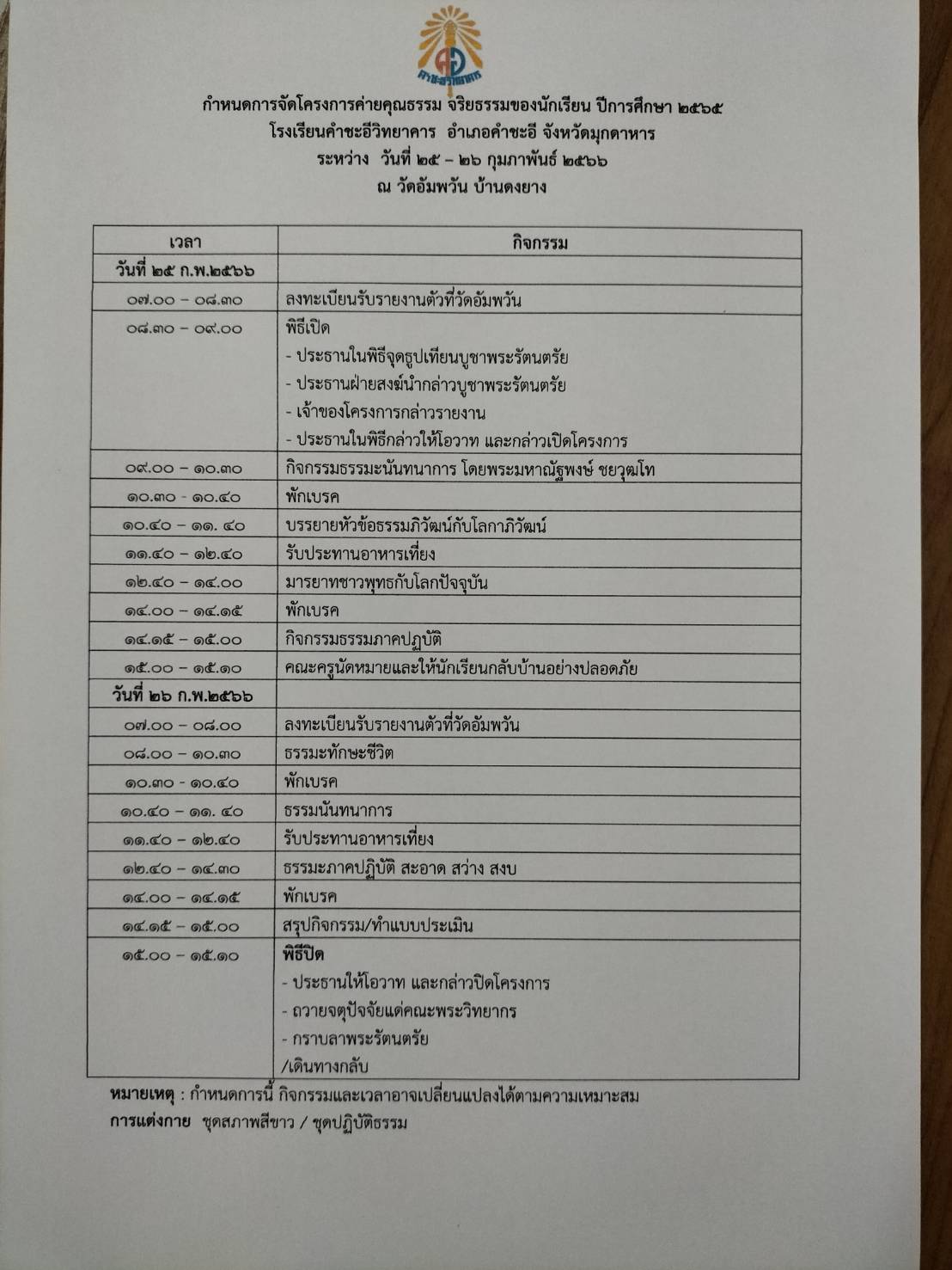 ในระหว่างวันที่ ๒๕ – ๒๖ กุมภาพันธ์ พ.ศ.๒๕๖๖ โรงเรียนคำชะอีวิทยาคาร จัดกิจกรรมตามโครงการค่ายคุณธรรม-จริยธรรม ที่มุ่งส่งเสริมให้นักเรียนได้มีโอกาสพัฒนาตนเองด้านคุณธรรม จริยธรรม ค่านิยมที่พึงประสงค์ รวมทั้งค่านิยมของคนไทย 12 ประการ โดยใช้หลักธรรมคำสอนของศาสนาเป็นแนวทางในการดำเนินชีวิต