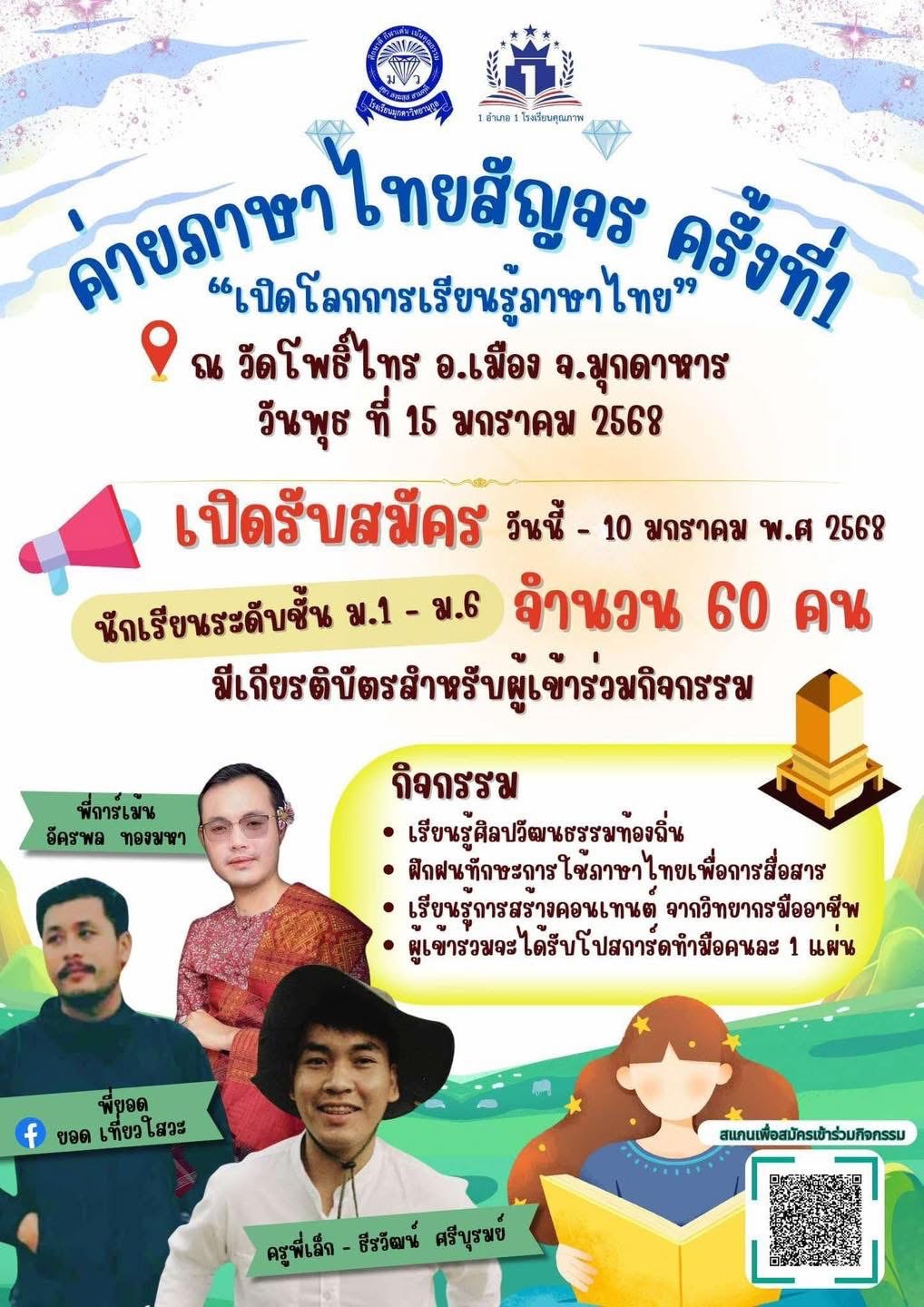 ครูธีรวัฒน์ ศรีบุรมย์ เป็นวิทยากรค่ายภาษาไทยสัญจร ครั้งที่ ๑ “เปิดโลกการเรียนรู้ภาษาไทย“ โรงเรียนมุกดาวิทยานุกูล ณ วัดโพธิ์ไทร อ.เมือง จ.มุกดาหาร ในวันพุธ ที่ ๑๕ มกราคม พ.ศ. ๒๕๖๘