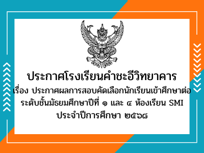 ประกาศผลการสอบคัดเลือกนักเรียนเข้าศึกษาต่อห้องเรียน SMI ชั้น ม.๑ และ ม.๔ ประจำปีการศึกษา ๒๕๖๘