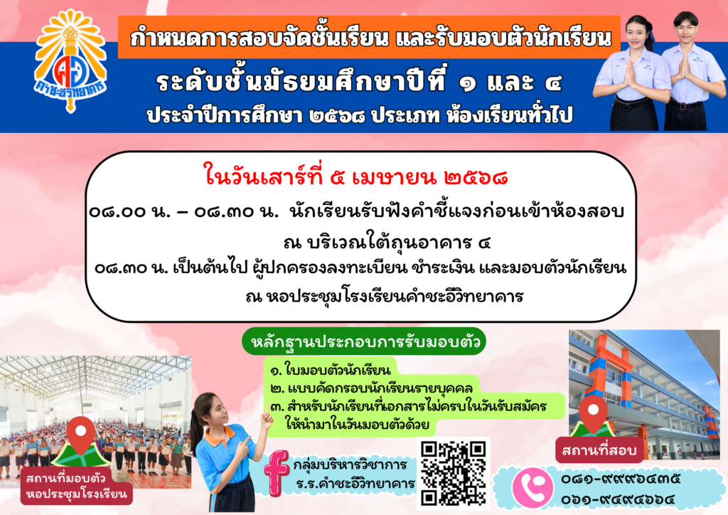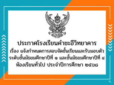 ข่าวประชาสัมพันธ์/ประกาศ ประกาศแจ้งกำหนดการสอบจัดชั้นเรียนและมอบตัวนักเรียน ม.๑ และ ม.๔ ห้องเรียนทั่วไป ปีการศึกษา ๒๕๖๘ April 1, 2025April 1, 2025 admin 0 Comments ยอดผู้อ่าน 525