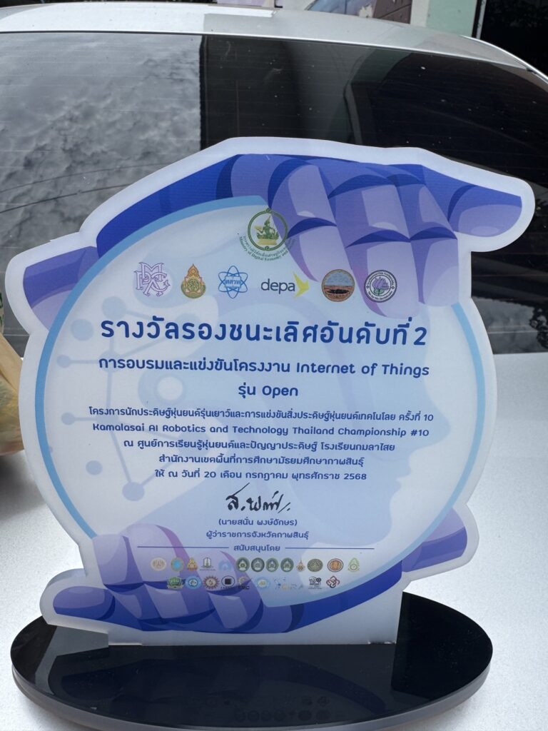 รับโล่รางวัลรองชนะเลิศอันดับ ๒ โครงงาน Internet of Things ( Open ) ถ้วยรางวัลพระราชทาน สมเด็จพระกนิษฐาธิราชเจ้าฯ [ชลันธร / ปริรัตน์ / ปลายฟ้า ม.4/1 ห้องเรียน SMI]