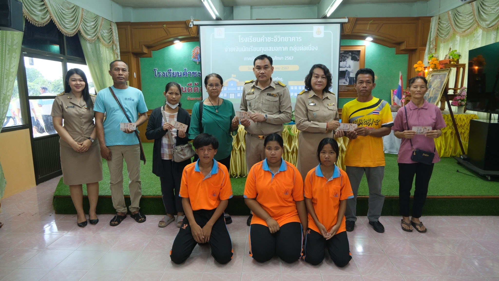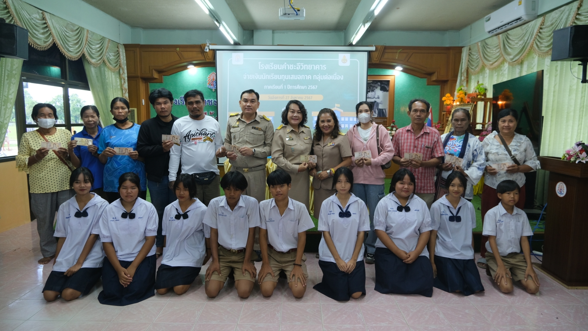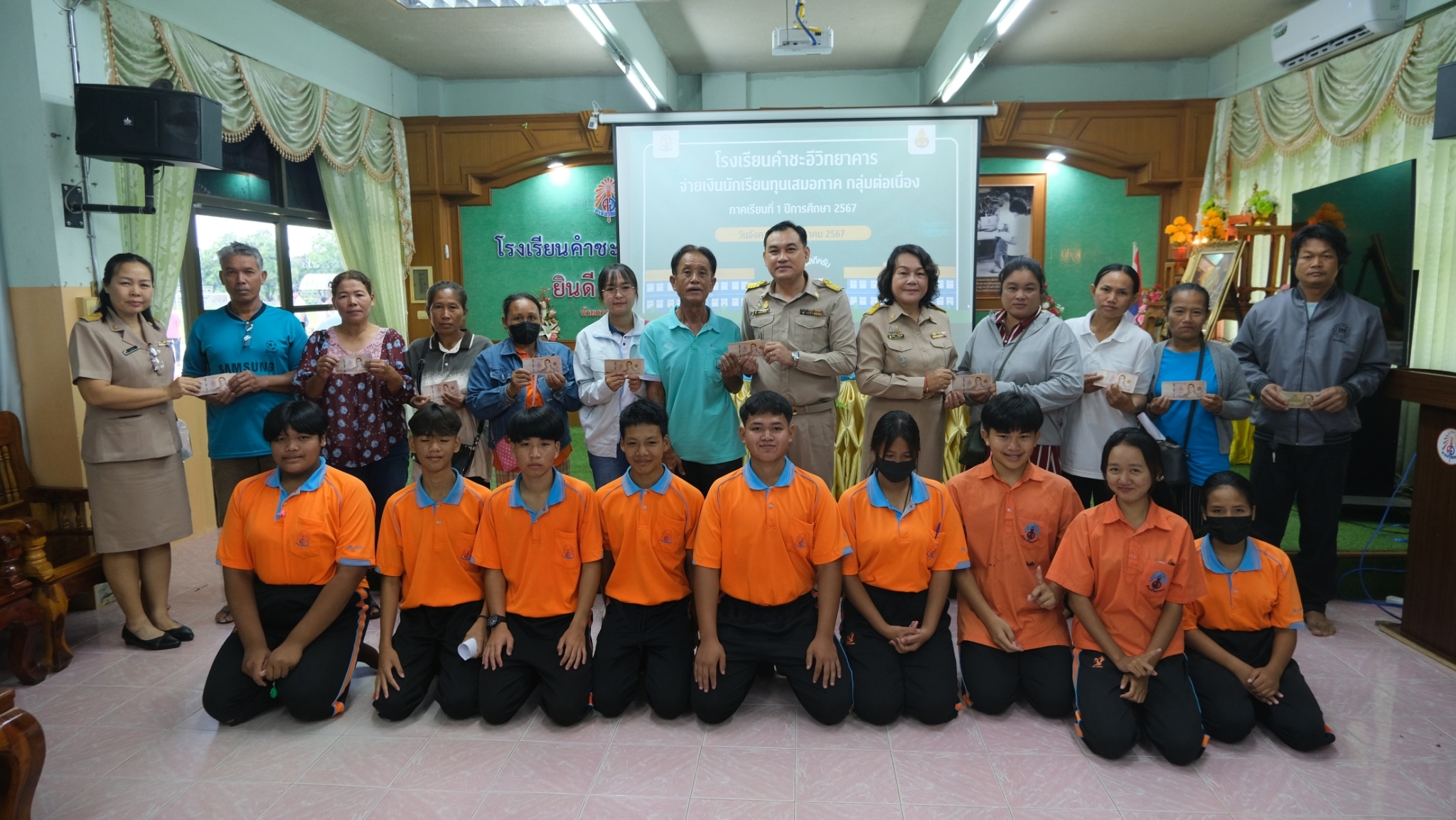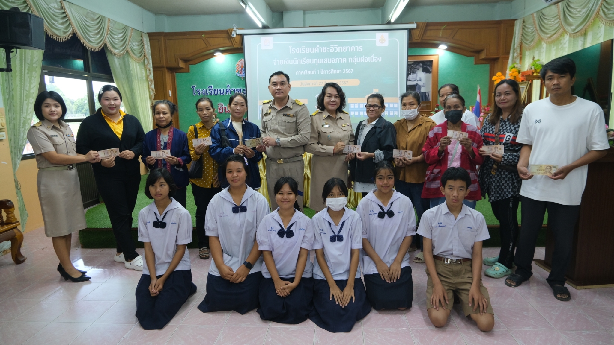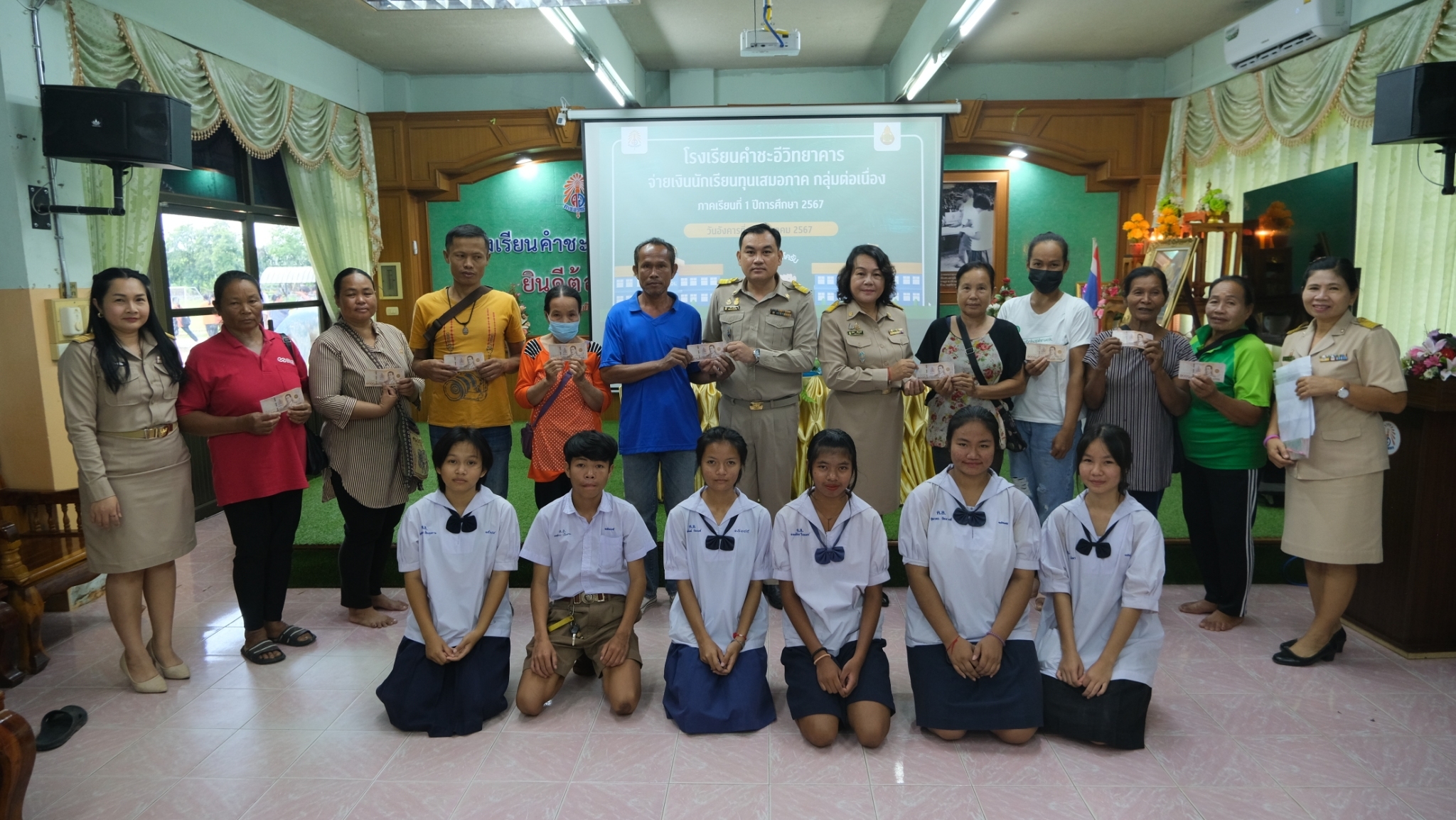 นางอุลิยา ศรีบุรมย์ และ นายวิชิต บุรัตน์ รองผู้อำนวยการโรงเรียนคำชะอีวิทยาคาร เป็นประธานมอบทุนเสมอภาคทางการศึกษา ให้กับนักเรียนชั้นมัธยมศึกษาตอนต้น ทุนละ ๑,๗๔o บาท ประจำภาคเรียนที่ ๑/๒๕๖๗