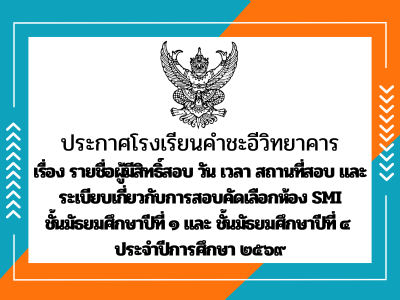 ประกาศรายชื่อ ผู้มีสิทธิ์สอบ วัน เวลา สถานที่สอบ และระเบียบเกี่ยวกับการสอบคัดเลือกนักเรียนเข้าเรียนห้องเรียนพิเศษวิทยาศาสตร์ คณิตศาสตร์ และนวัตกรรม (SMI) ระดับชั้นมัธยมศึกษาปีที่ ๑ และ ชั้นมัธยมศึกษาปีที่ ๔