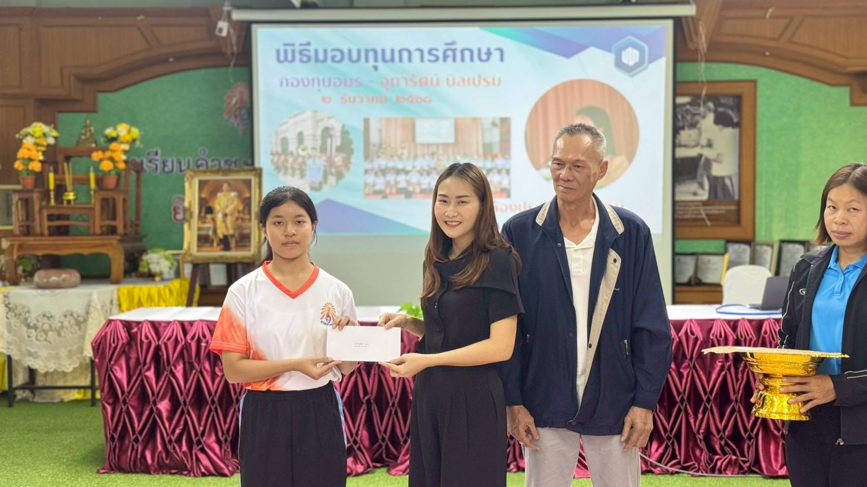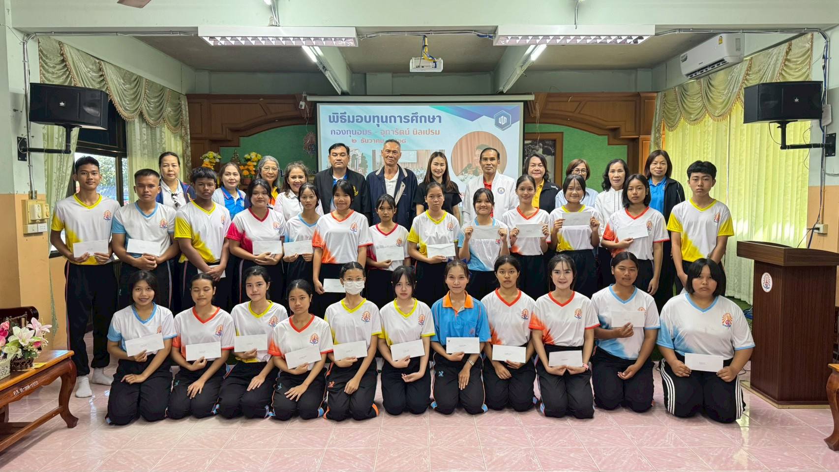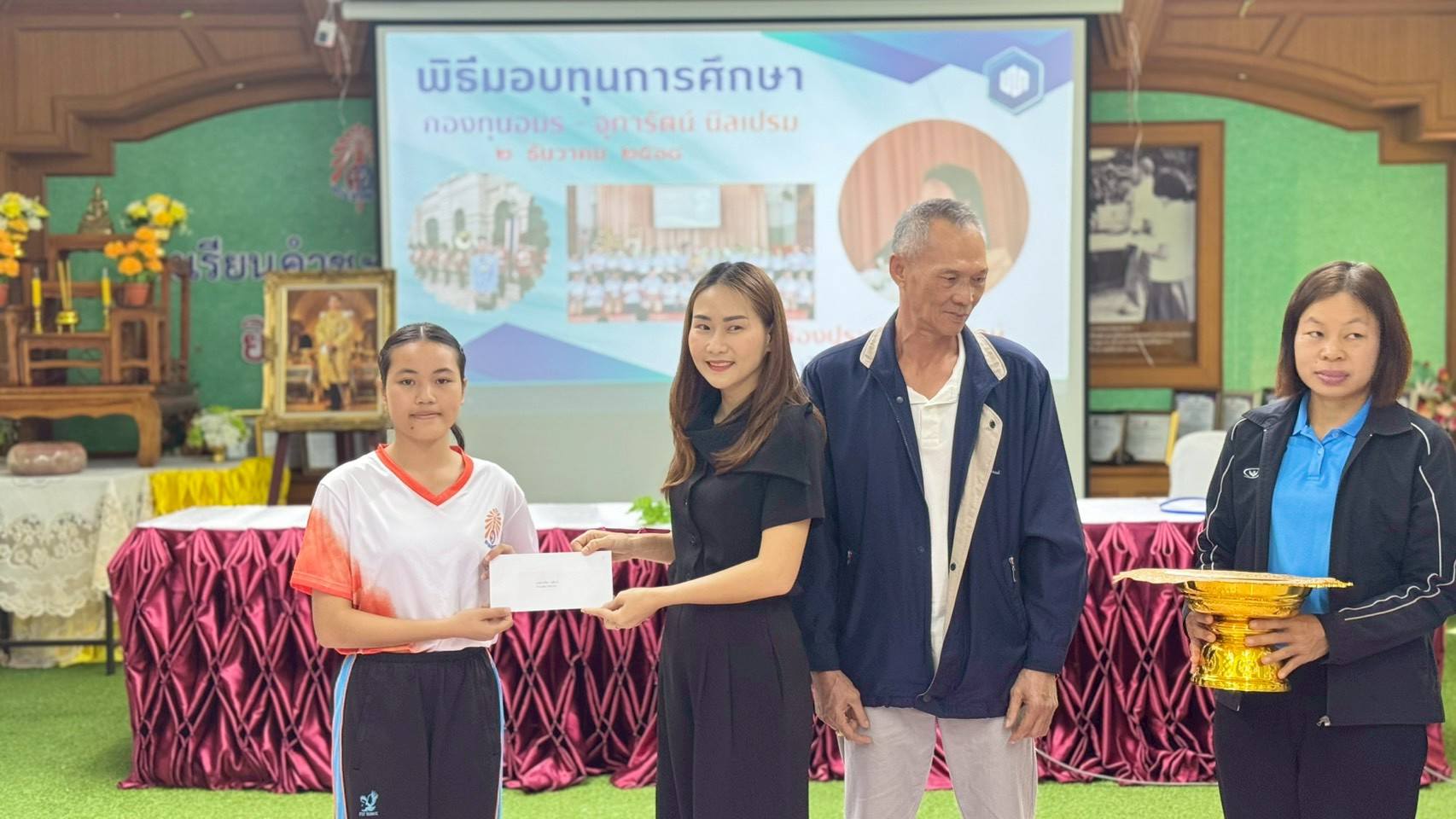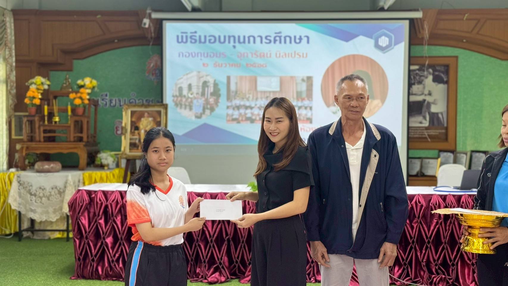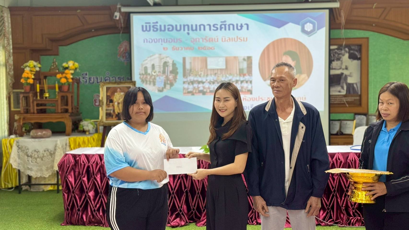 - ภายในพิธีได้รับเกียรติจากผู้บริหาร ครู บุคลากรทางการศึกษา รวมถึงผู้แทนกองทุนร่วมเป็นเกียรติในพิธี โดยได้มอบทุนการศึกษาให้แก่นักเรียนที่ได้รับการคัดเลือกตามหลักเกณฑ์ของกองทุน เพื่อเป็นกำลังใจในการศึกษาเล่าเรียนและส่งเสริมให้นักเรียนมุ่งมั่นพัฒนาตนเองอย่างต่อเนื่อง