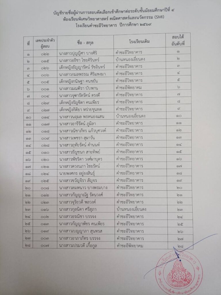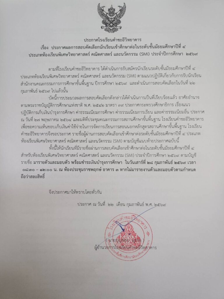 ข่าวประชาสัมพันธ์/ประกาศ ผลการสอบคัดเลือกนักเรียนเข้าศึกษาต่อในระดับชั้นมัธยมศึกษาปีที่ ๔ ประเภทห้องเรียนพิเศษวิทยาศาสตร์ คณิตศาสตร์ และนวัตกรรม (SMI) ประจำปีการศึกษา ๒๕๖๙ February 22, 2026February 22, 2026 admin 0 Comments ยอดผู้อ่าน 50