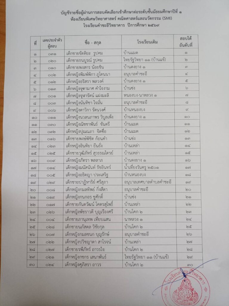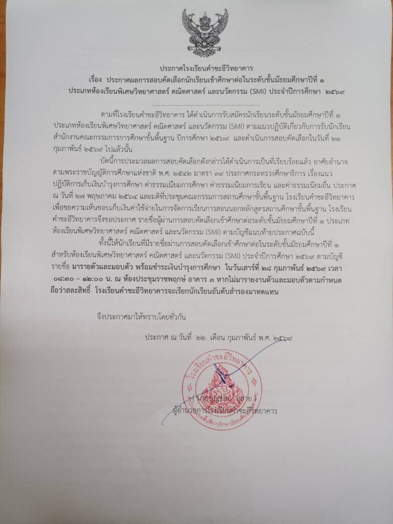 ข่าวประชาสัมพันธ์/ประกาศ ผลการสอบคัดเลือกนักเรียนเข้าศึกษาต่อในระดับชั้นมัธยมศึกษาปีที่ ๑ ประเภทห้องเรียนพิเศษวิทยาศาสตร์ คณิตศาสตร์ และนวัตกรรม (SMI) ประจำปีการศึกษา ๒๕๖๙ February 22, 2026February 22, 2026 admin 0 Comments ยอดผู้อ่าน 47