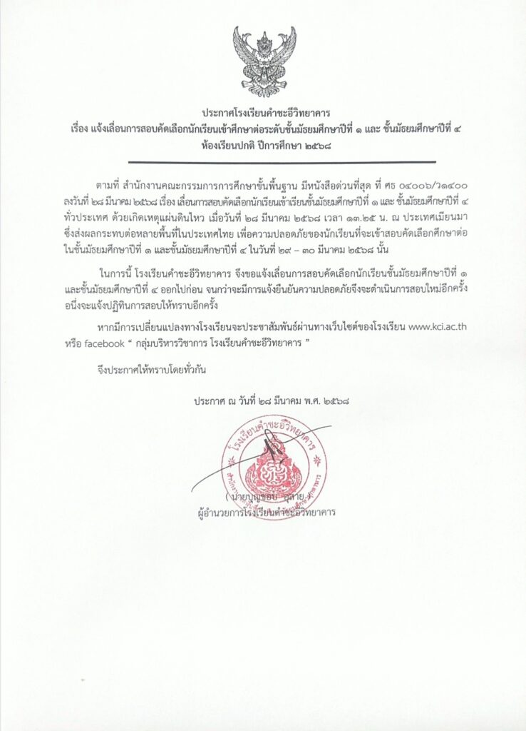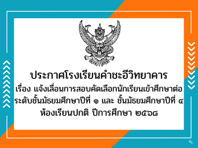 ข่าวประชาสัมพันธ์/ประกาศ แจ้งเลื่อนการสอบคัดเลือกนักเรียนเข้าศึกษาต่อระดับชั้นมัธยมศึกษาปีที่ ๑ และ ชั้นมัธยมศึกษาปีที่ ๔ห้องเรียนปกติ ปีการศึกษา ๒๕๖๘ March 28, 2025March 28, 2025 admin 0 Comments ยอดผู้อ่าน 493