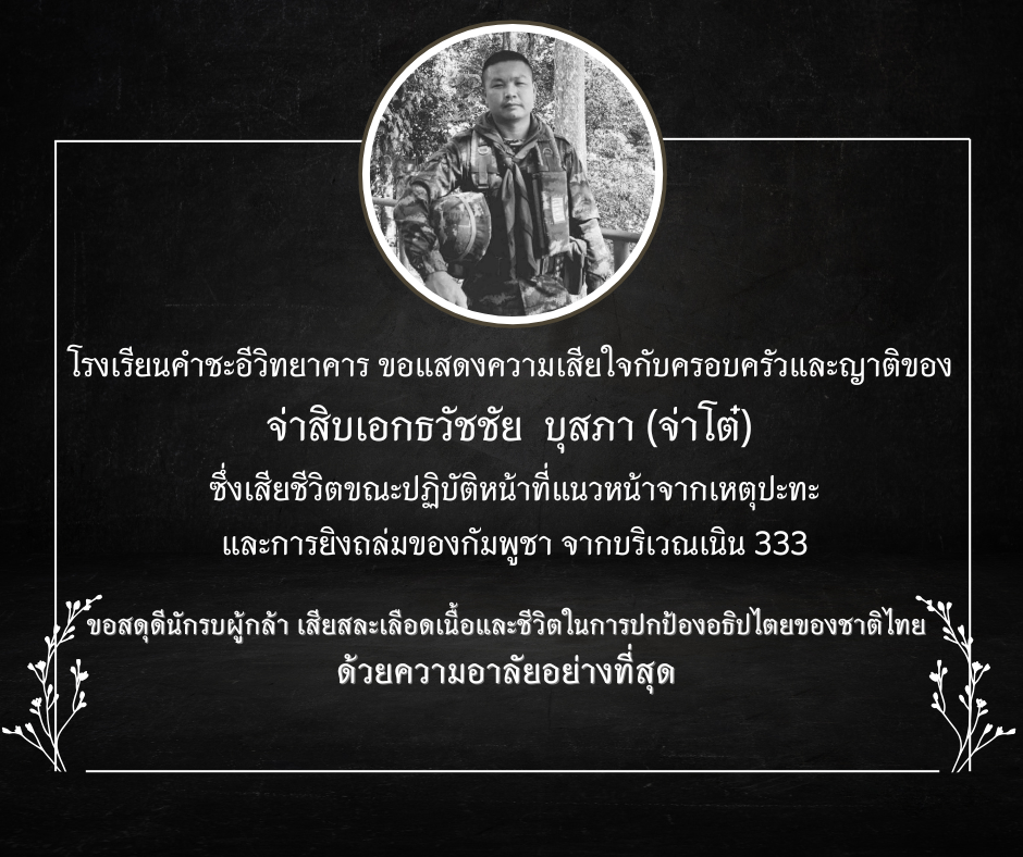 ข่าวประชาสัมพันธ์/ประกาศ โรงเรียนคำชะอีวิทยาคาร ขอแสดงความเสียใจกับครอบครัวและญาติของ จ่าสิบเอกธวัชชัย บุสภา (จ่าโต๋) ซึ่งเสียชีวิตขณะปฏิบัติหน้าที่แนวหน้าจากเหตุปะทะและการยิงถล่มของกัมพูชา จากบริเวณเนิน 333 July 26, 2025July 26, 2025 admin 0 Comments ยอดผู้อ่าน 466