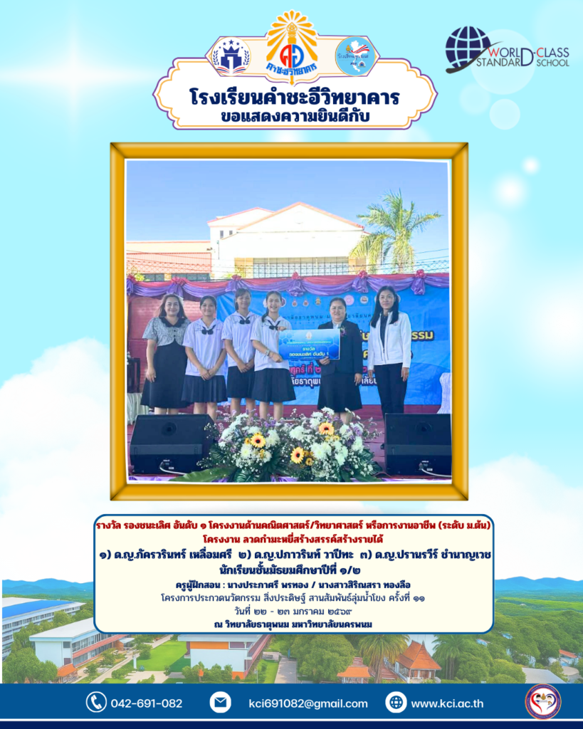 เผยแพร่ผลงานนักเรียน รางวัลรองชนะเลิศ อันดับ ๑ โครงงาน ด้านคณิตศาสตร์/วิทยาศาสตร์ หรือการงานอาชีพ (ระดับมัธยมศึกษาตอนต้น) January 28, 2026January 28, 2026 admin 0 Comments ยอดผู้อ่าน 37